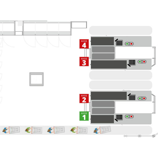 Es erfolgt eine automatische Ansage im Kassenbereich und die Kassenleuchten senden ein visuelles Signal.